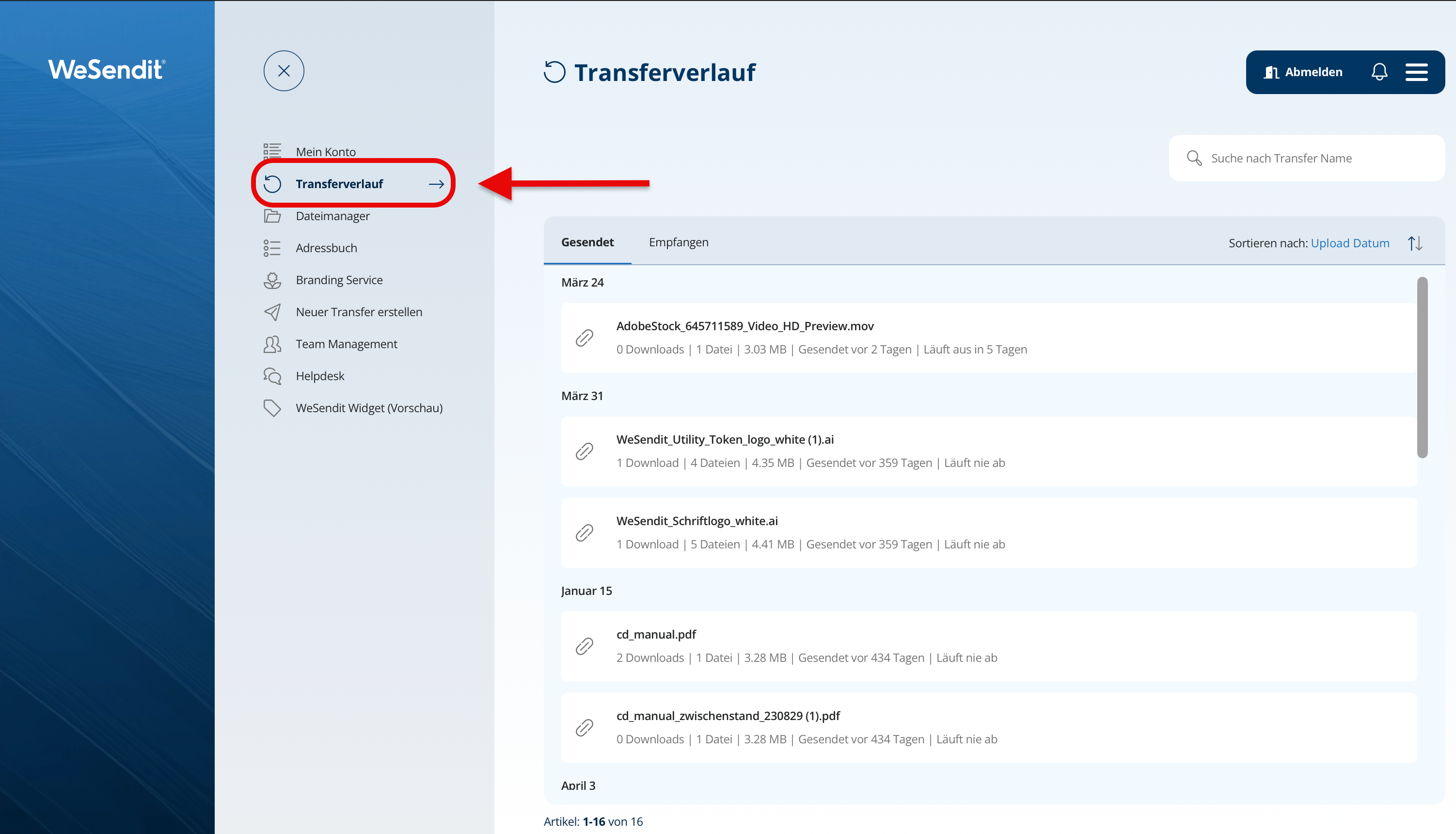 - Suchfunktion: Nutze das Suchfeld oben rechts, um einen Transfer anhand seines Namens oder des Betreffs schnell wiederzufinden.