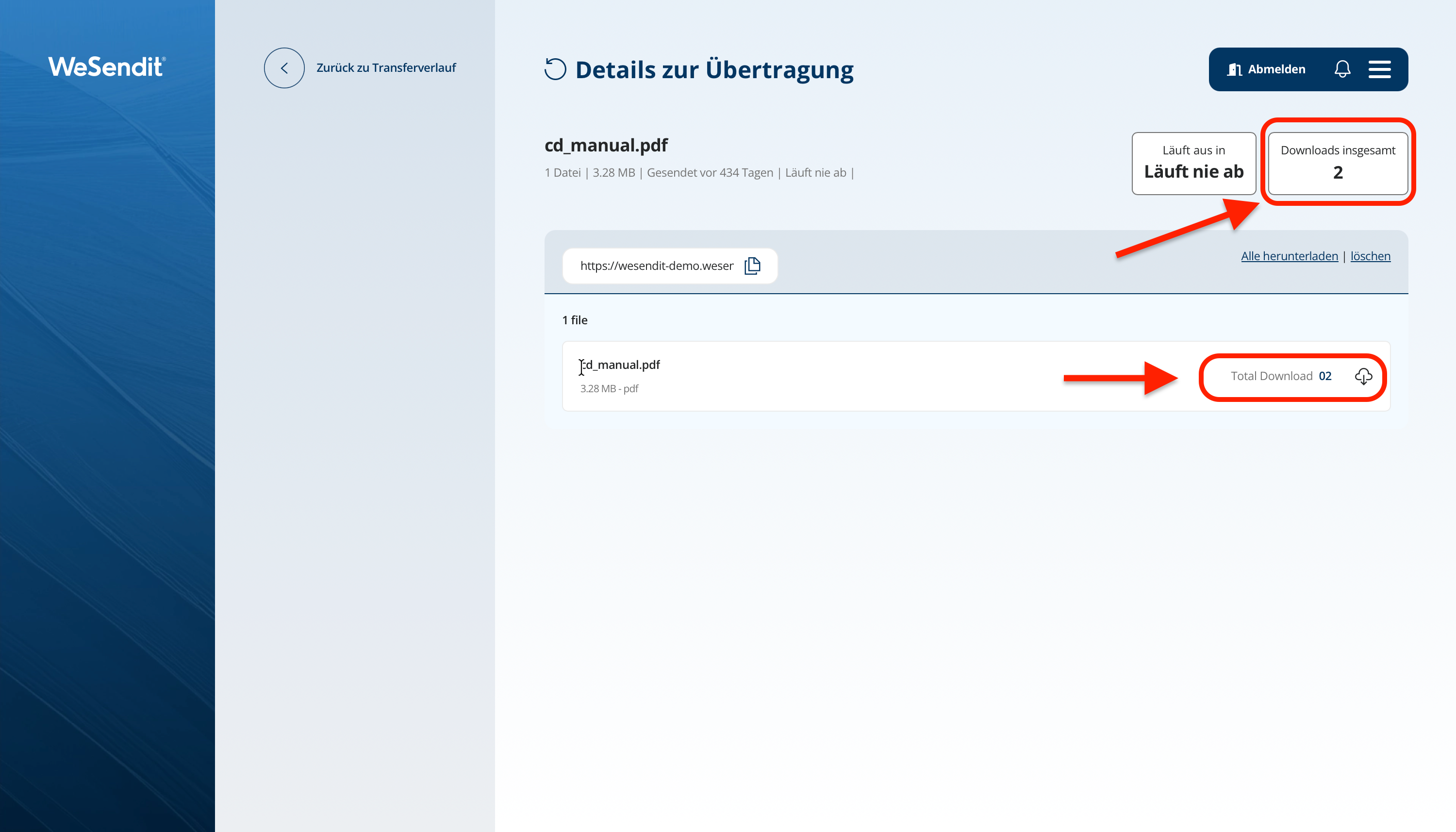 - Dateiliste: Siehe alle im Transfer enthaltenen Einzeldateien inklusive deren individueller Download-Anzahl.