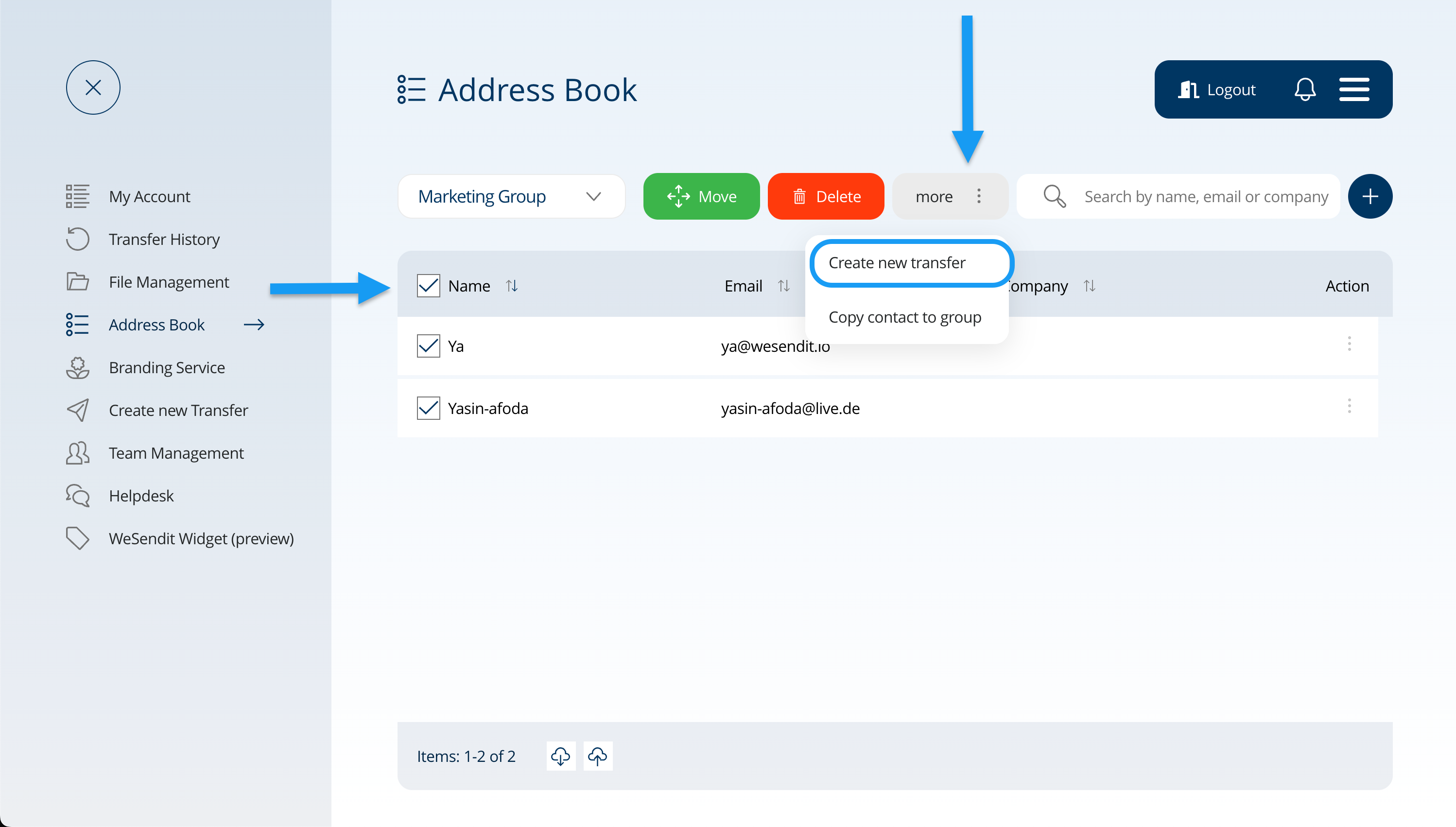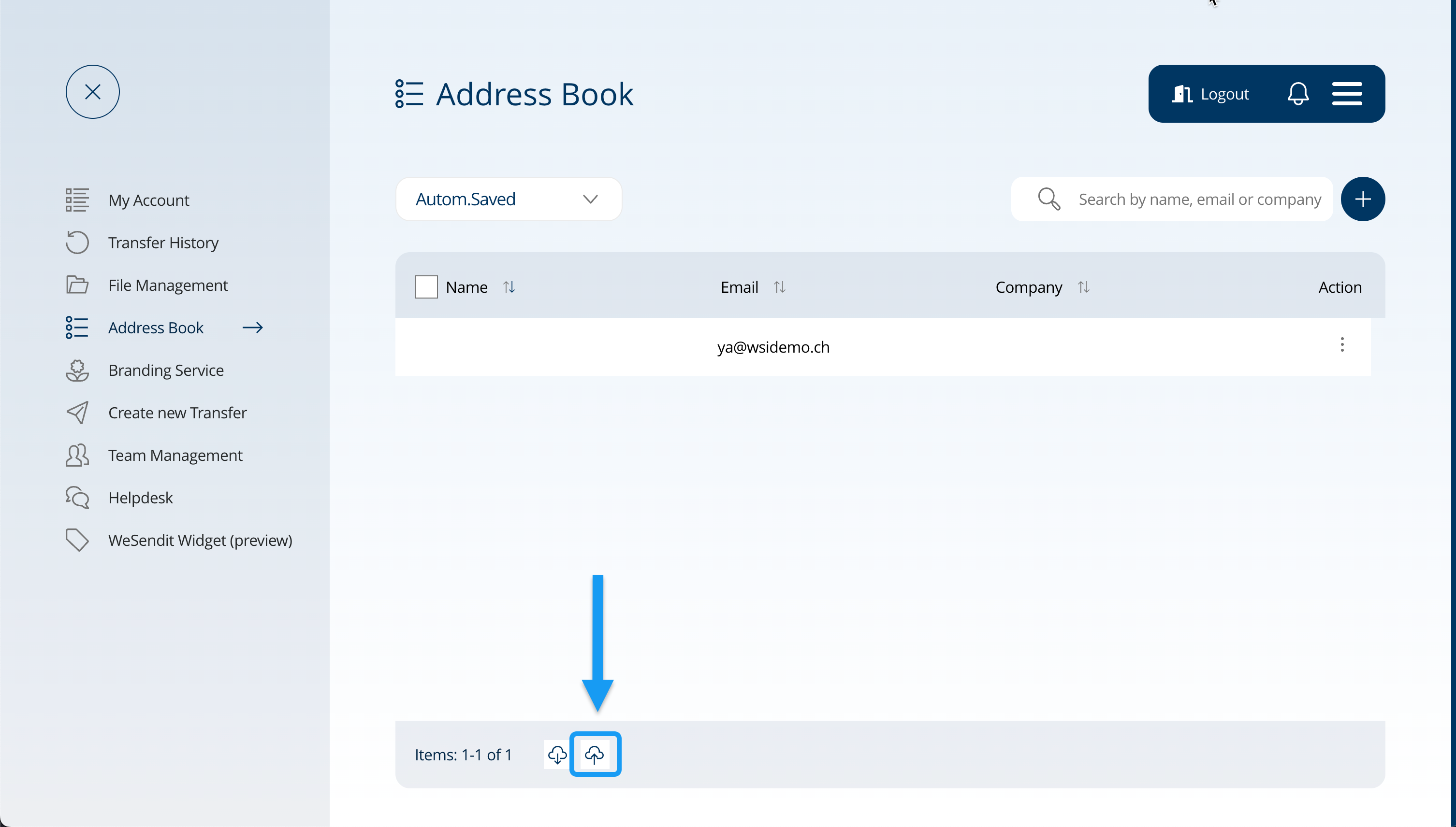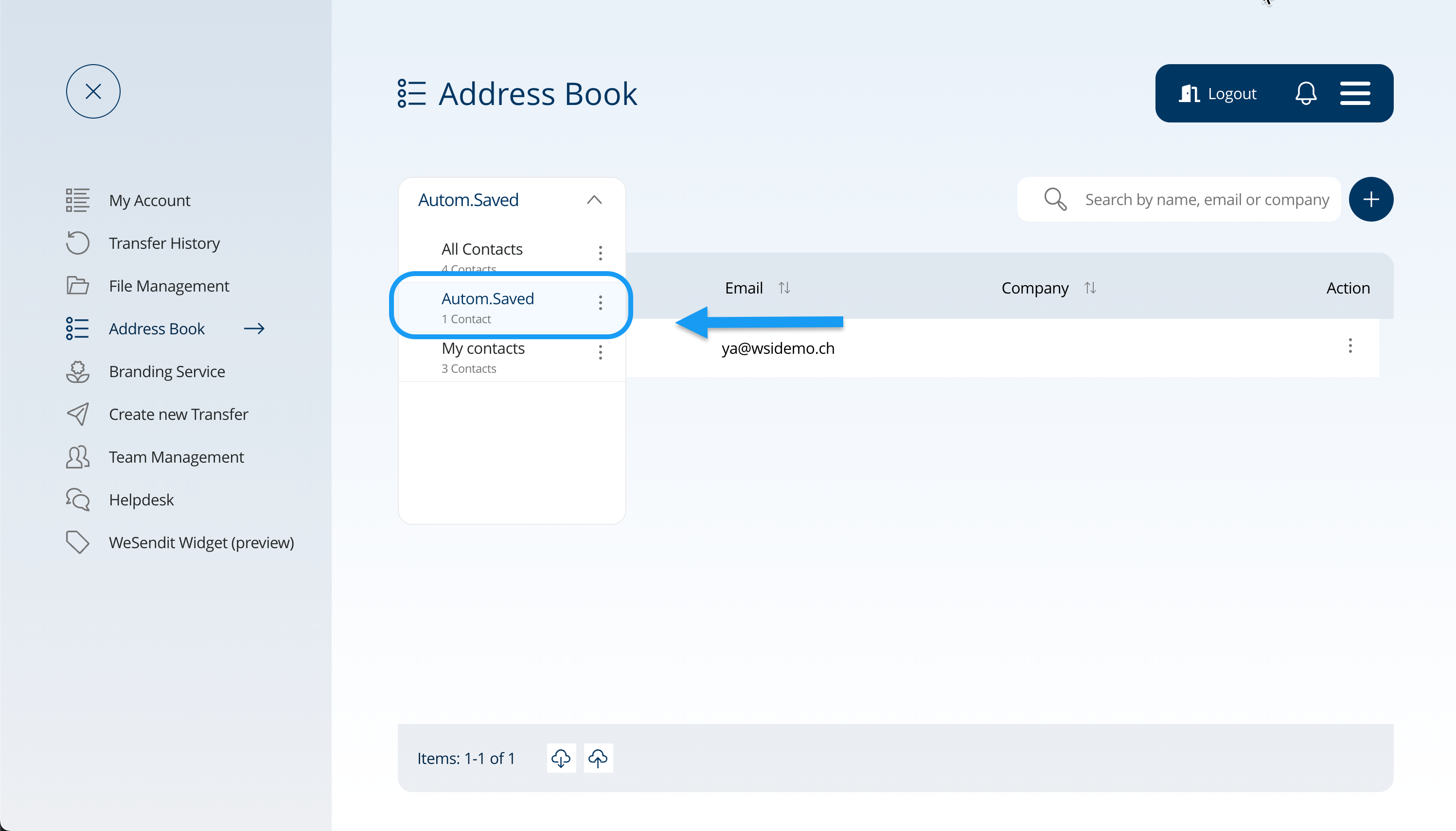 WeSendit denkt mit: Wenn Du eine Datei an einen neuen Empfänger sendest, speichert das System diese Adresse automatisch in der Gruppe „Autom. Saved“. So musst Du Kontakte, mit denen Du bereits interagiert hast, nicht manuell neu anlegen.