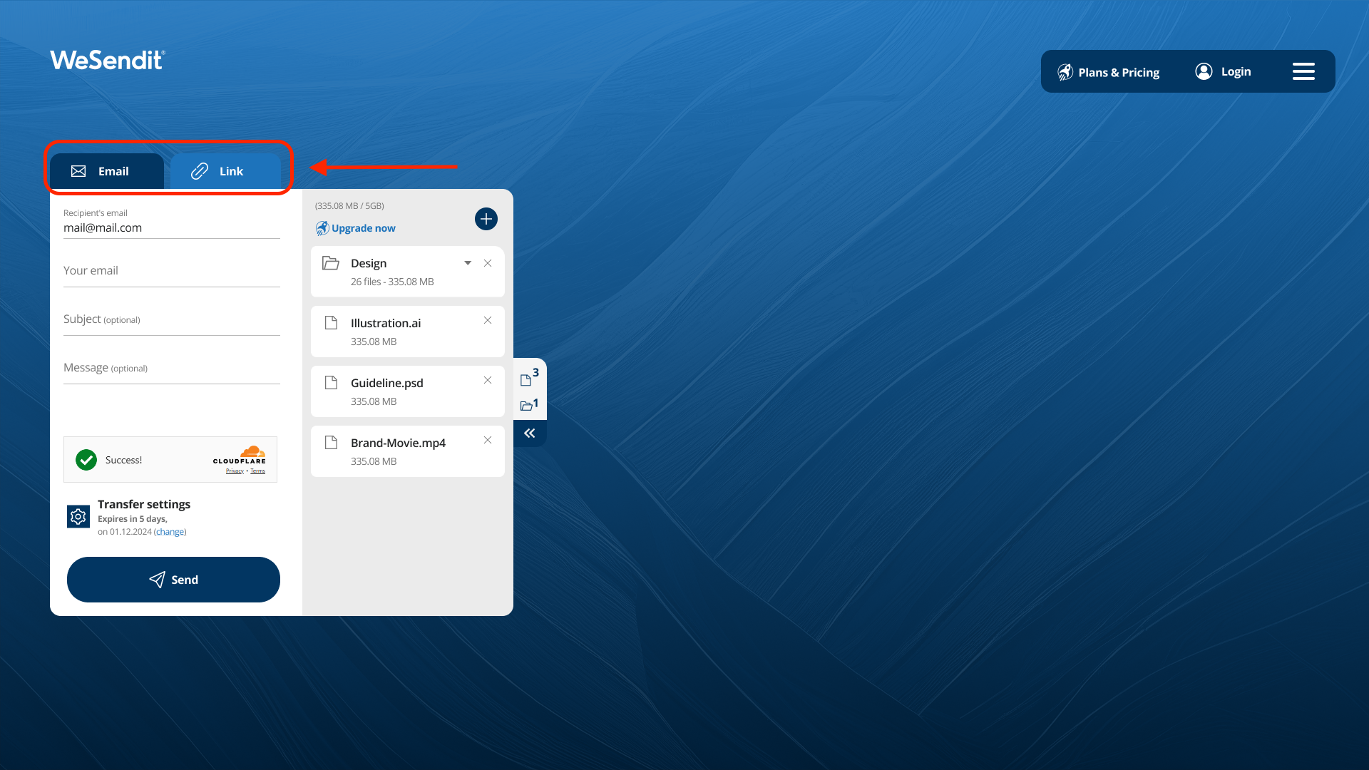 - Email Transfer: Du gibst die E-Mail-Adresse des Empfängers direkt ein. WeSendit® benachrichtigt Dich automatisch per Mail, wenn der Transfer erfolgreich gesendet wurde und sobald der Empfänger den Download startet.