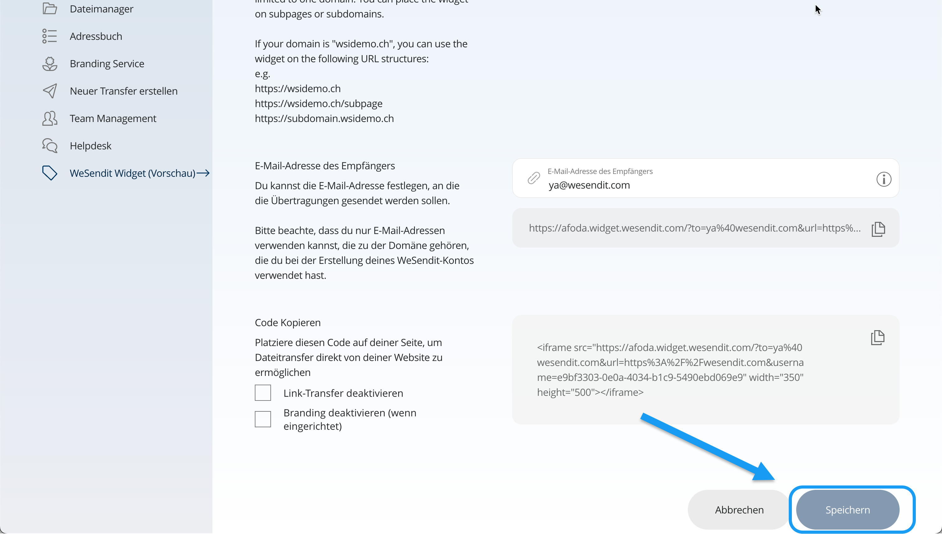 - Logge Dich in Deinen Account ein und wähle im Menü "WeSendit Widget".