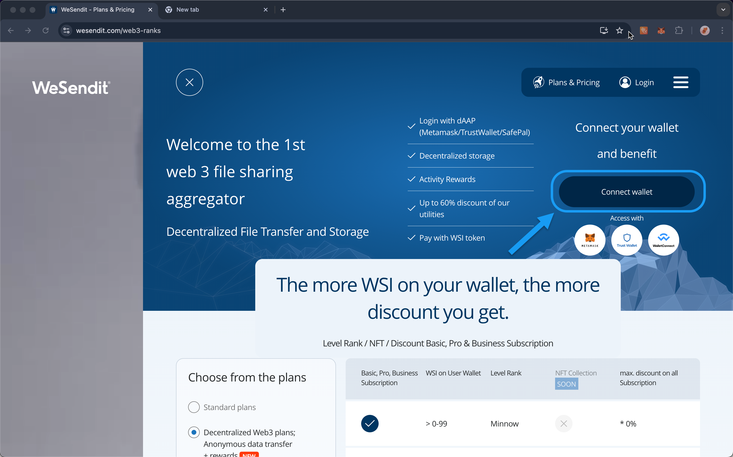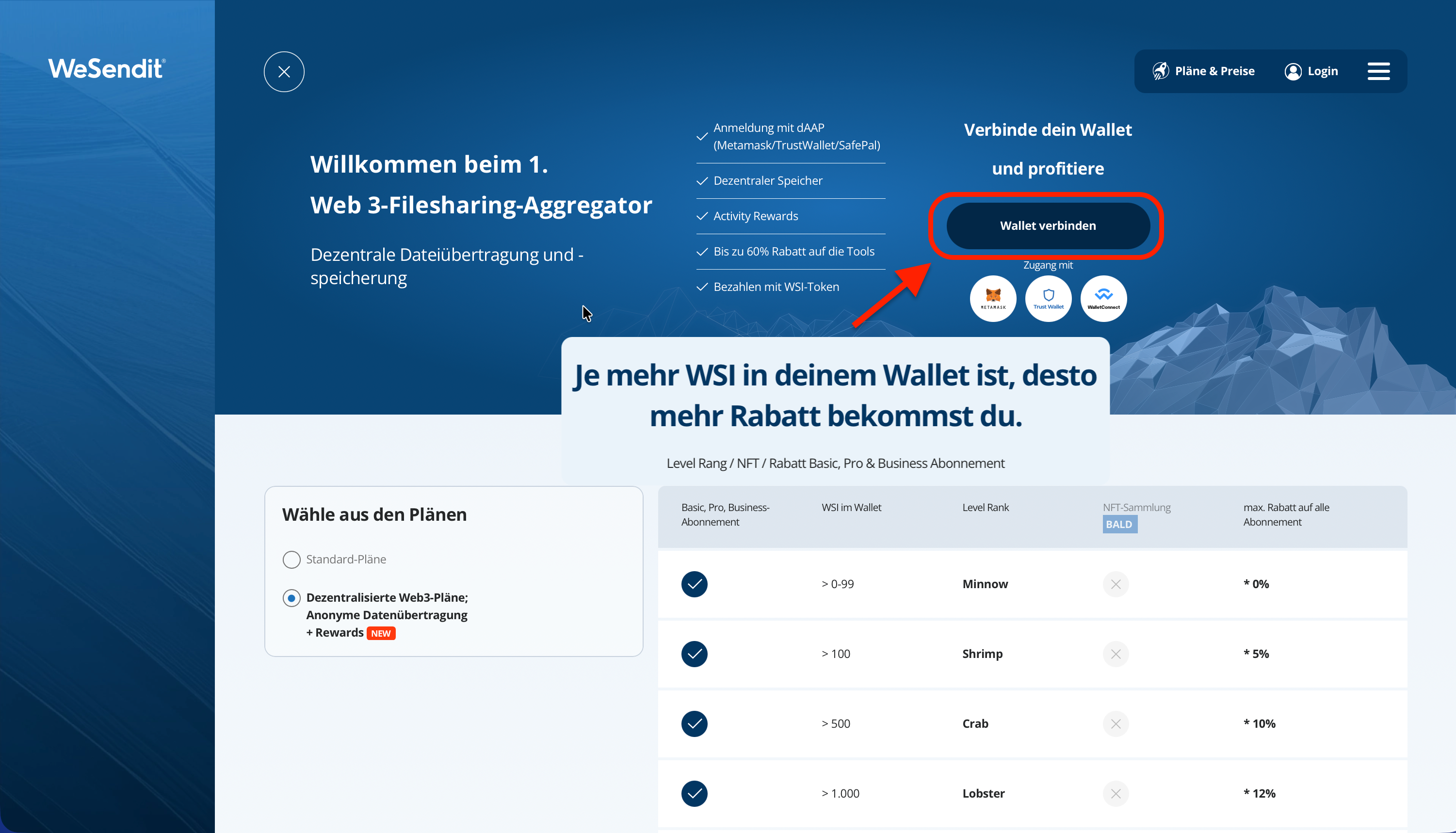 - Web 3 (Dezentrale Pläne): Diese Pläne nutzen Blockchain-Technologie für volle Datenkontrolle, höchste Anonymität und dezentrale Speicherung. Die Nutzung und Bezahlung erfolgt ausschließlich über den WSI-Token und eine Krypto-Wallet.