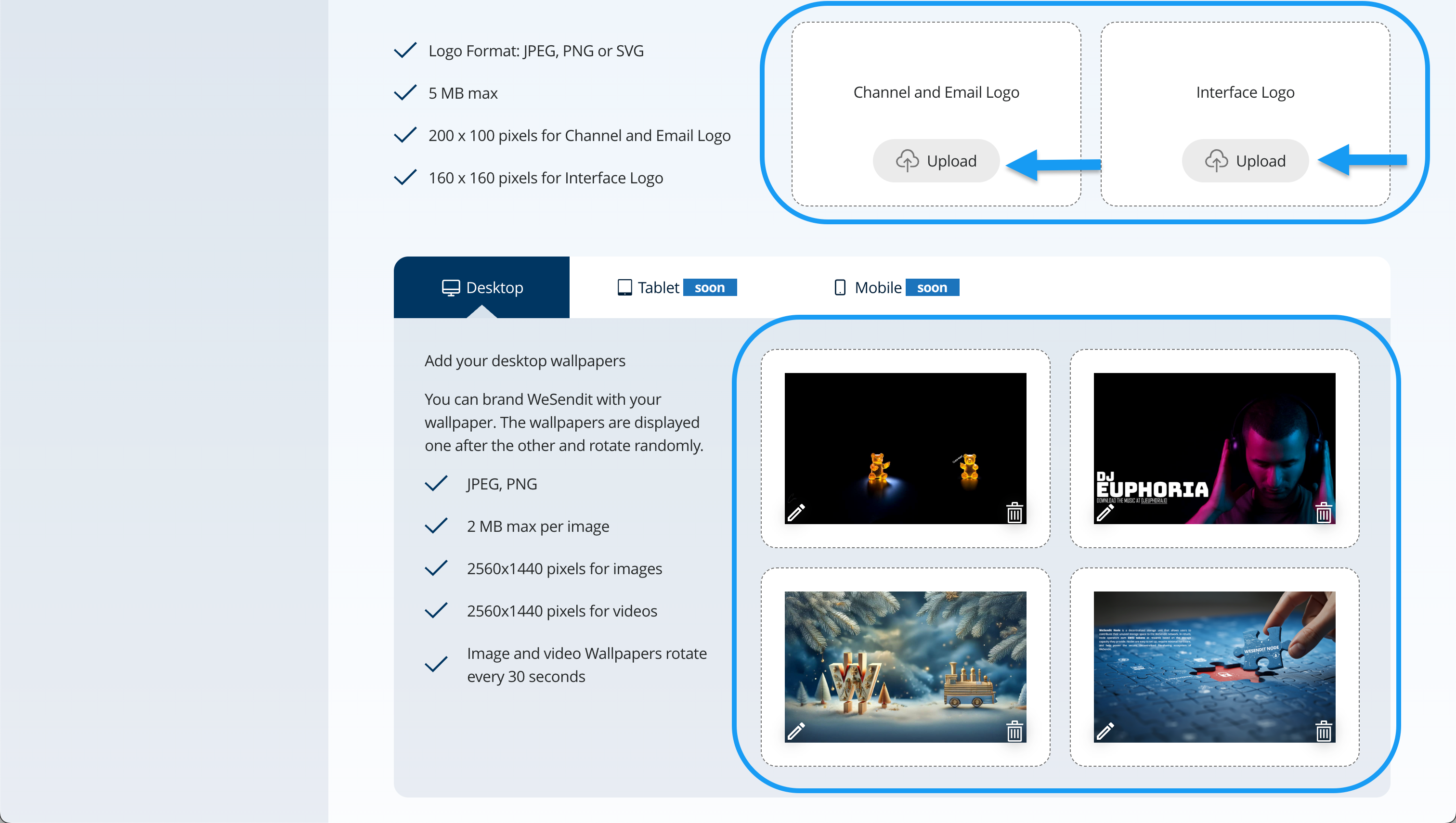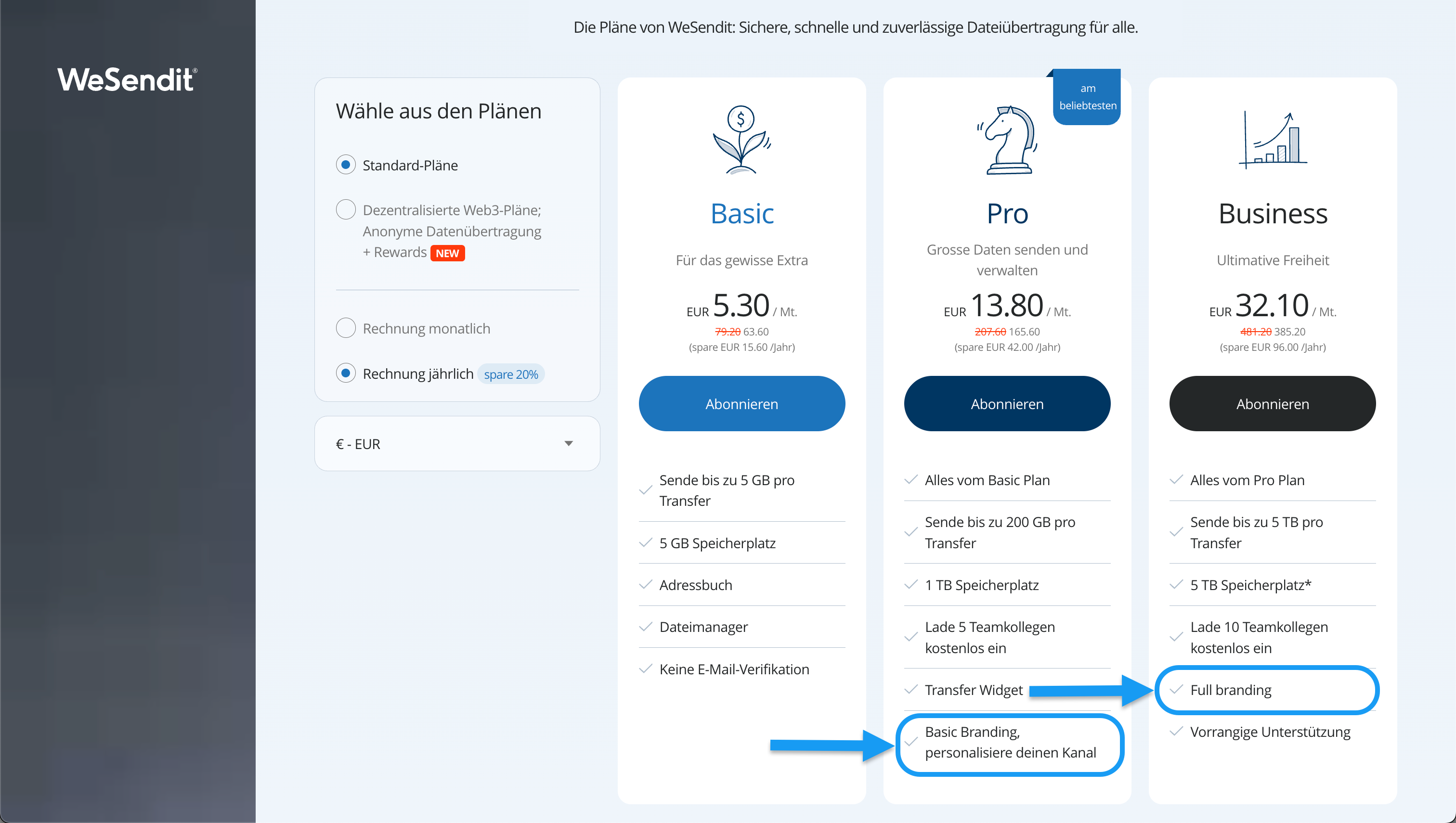 deinname.wesendit.com). - Full Branding: Bietet zusätzlich Logo-Uploads für das Interface und E-Mails, bis zu vier rotierende Hintergründe und die Verlinkung Deiner eigenen Website direkt im Wallpaper.