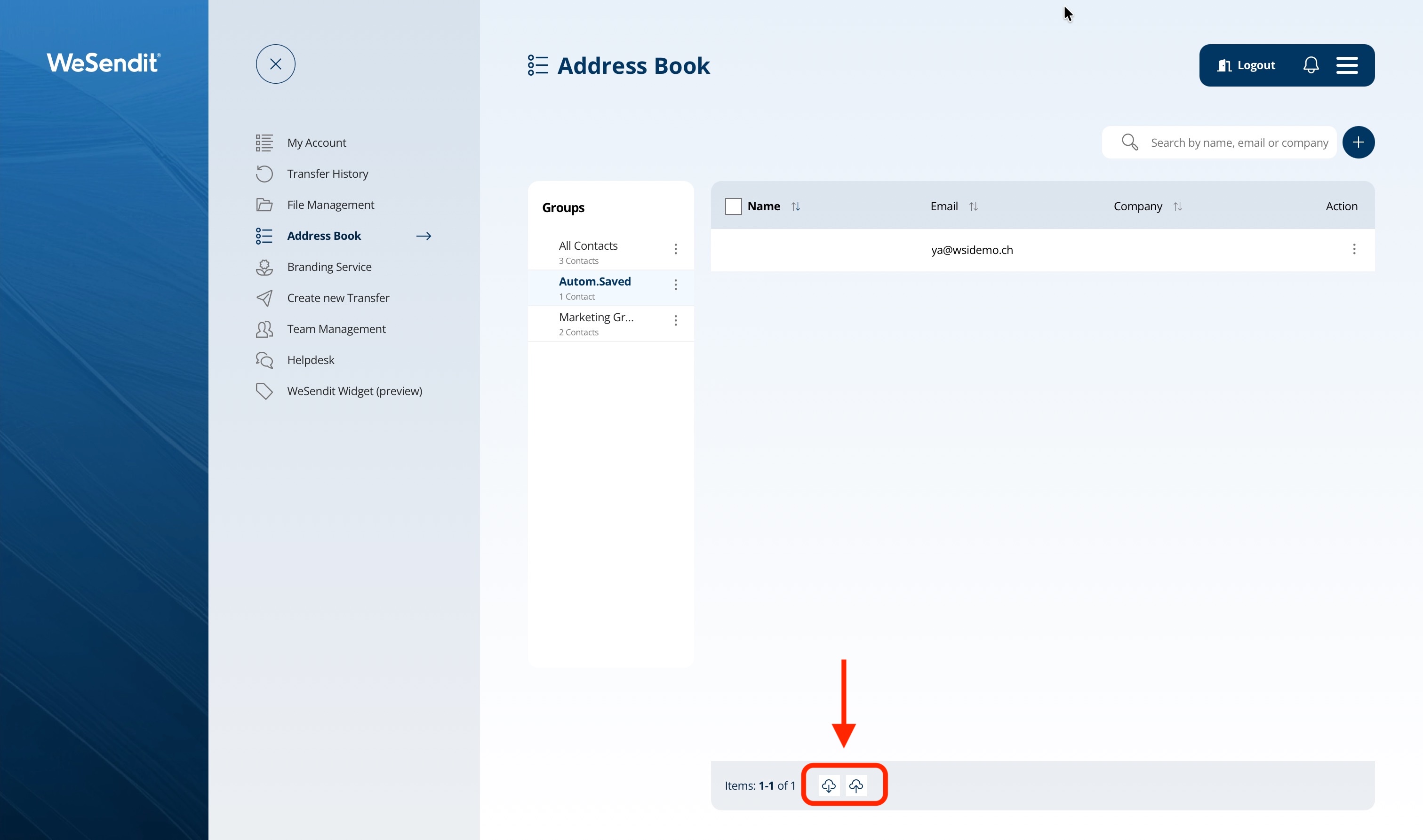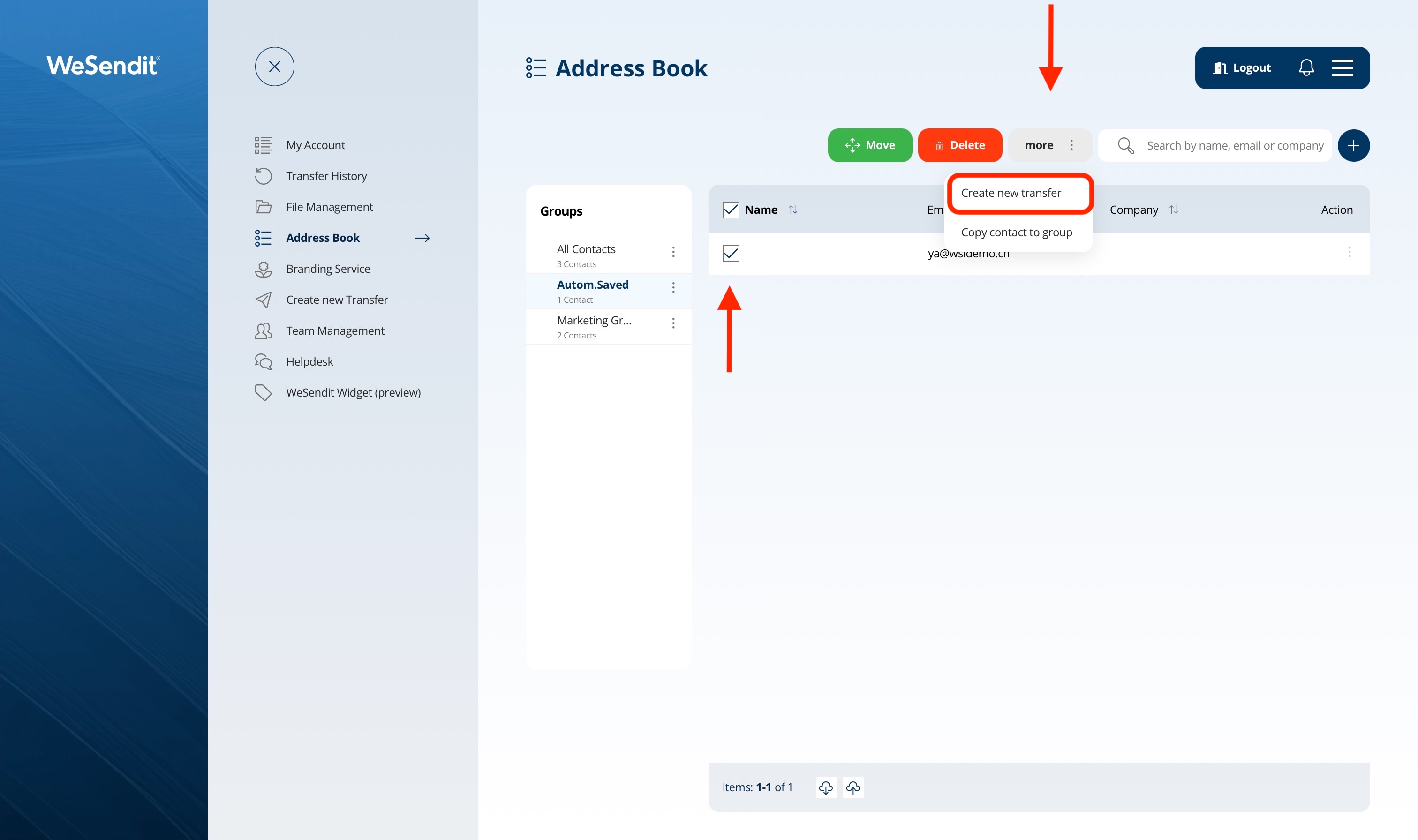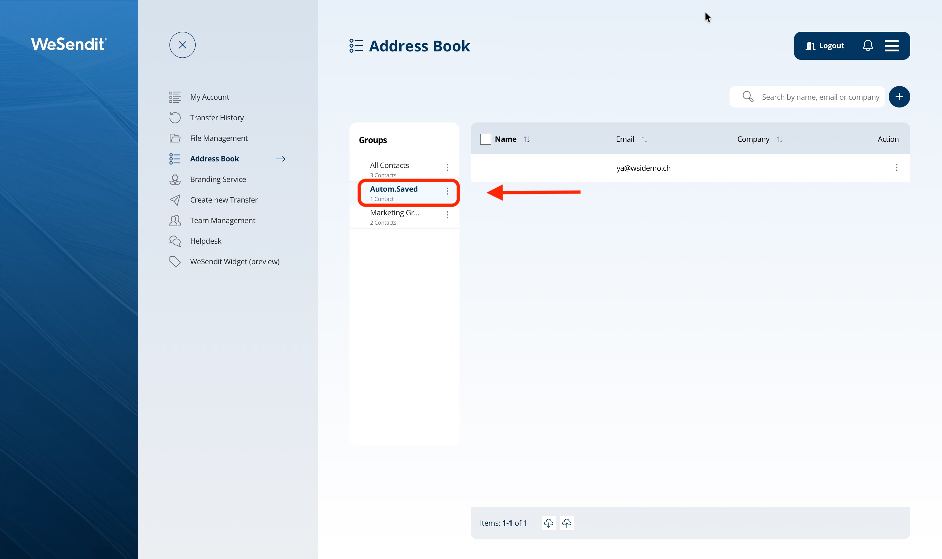 WeSendit® thinks ahead: When you send a file to a new recipient via email, the system automatically saves the address in the "Autom. Saved" group. This saves you from having to manually recreate contacts you've already interacted with.
