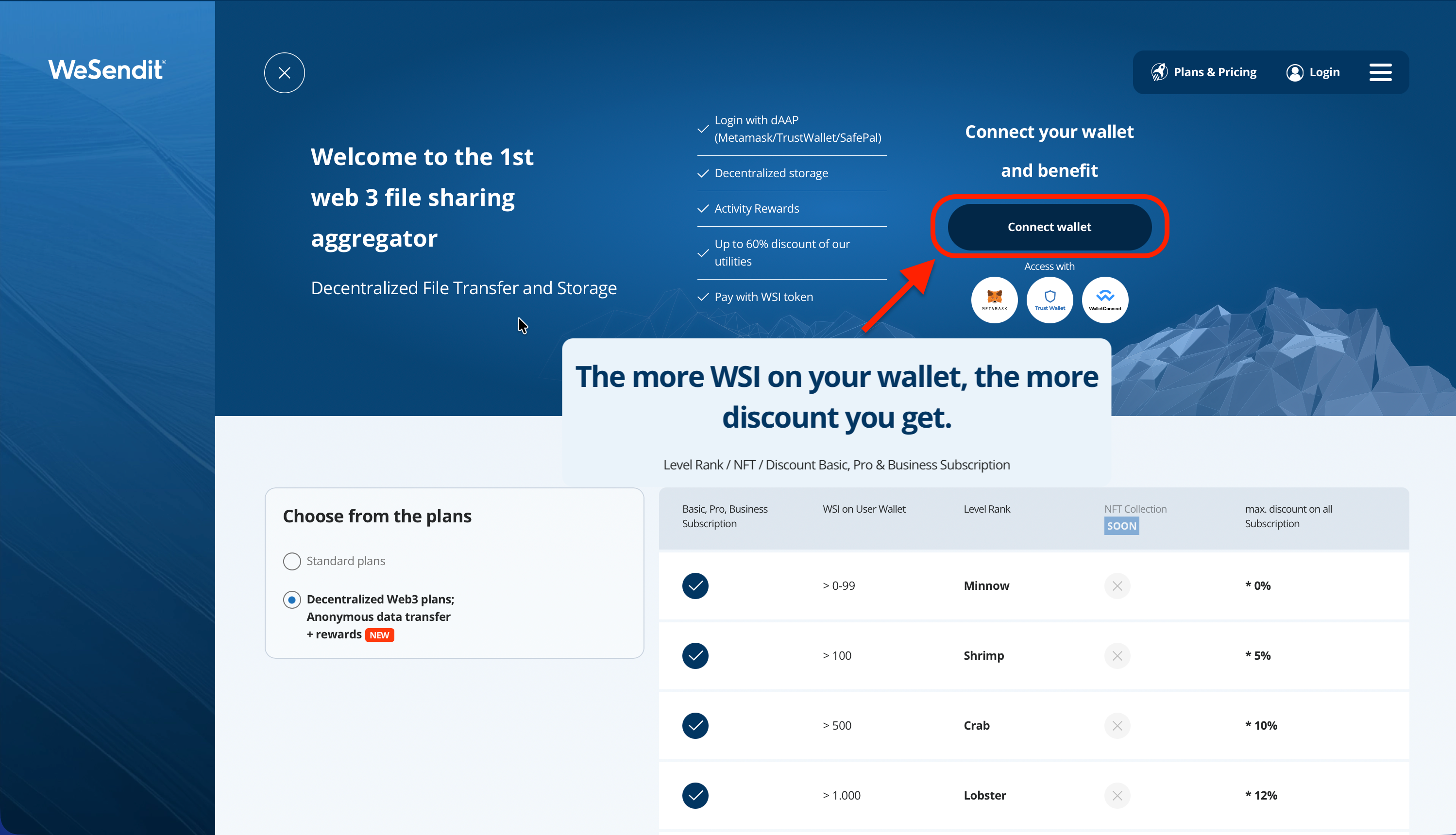 These plans use blockchain technology to provide full data control, maximum anonymity, and decentralized storage. Usage and payment are handled exclusively via the WSI token and a crypto wallet.