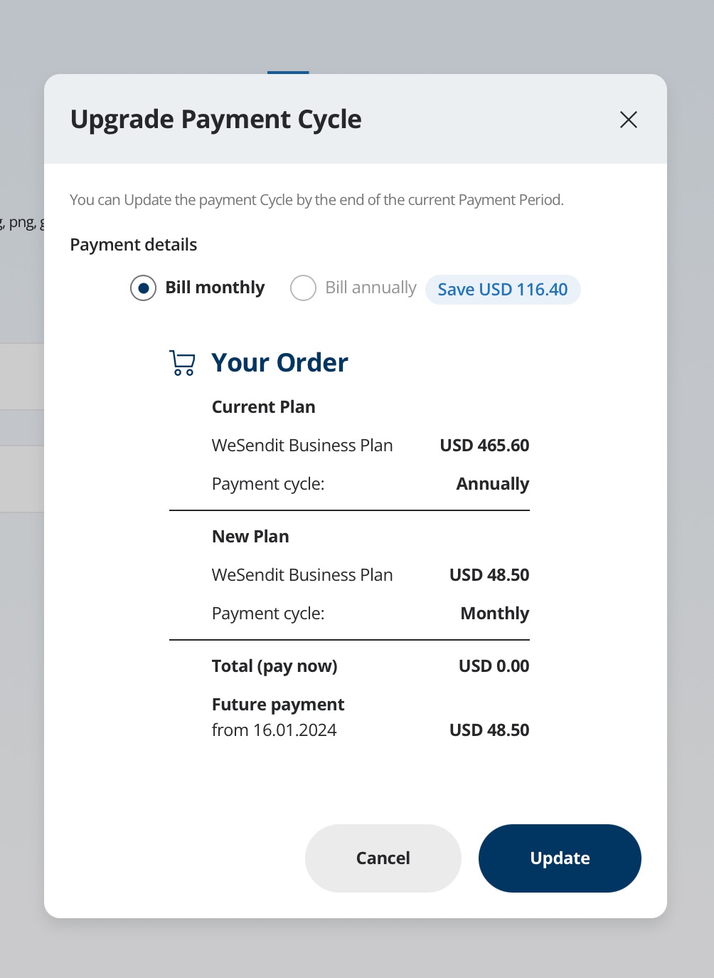 - Note: The current cycle (Monthly or Yearly) is not selectable. You can only switch to the other rhythm in this window. If you wish to change the plan (tier) instead, select "Change plan" in the previous step.