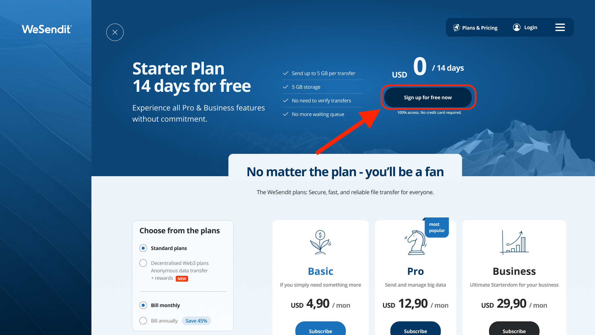 Creating a WeSendit® Web2 account is your first step towards seamless and secure file transfers. When you register, you'll automatically begin a free 14-day trial of our Starter plan, giving you access to premium features right away.
