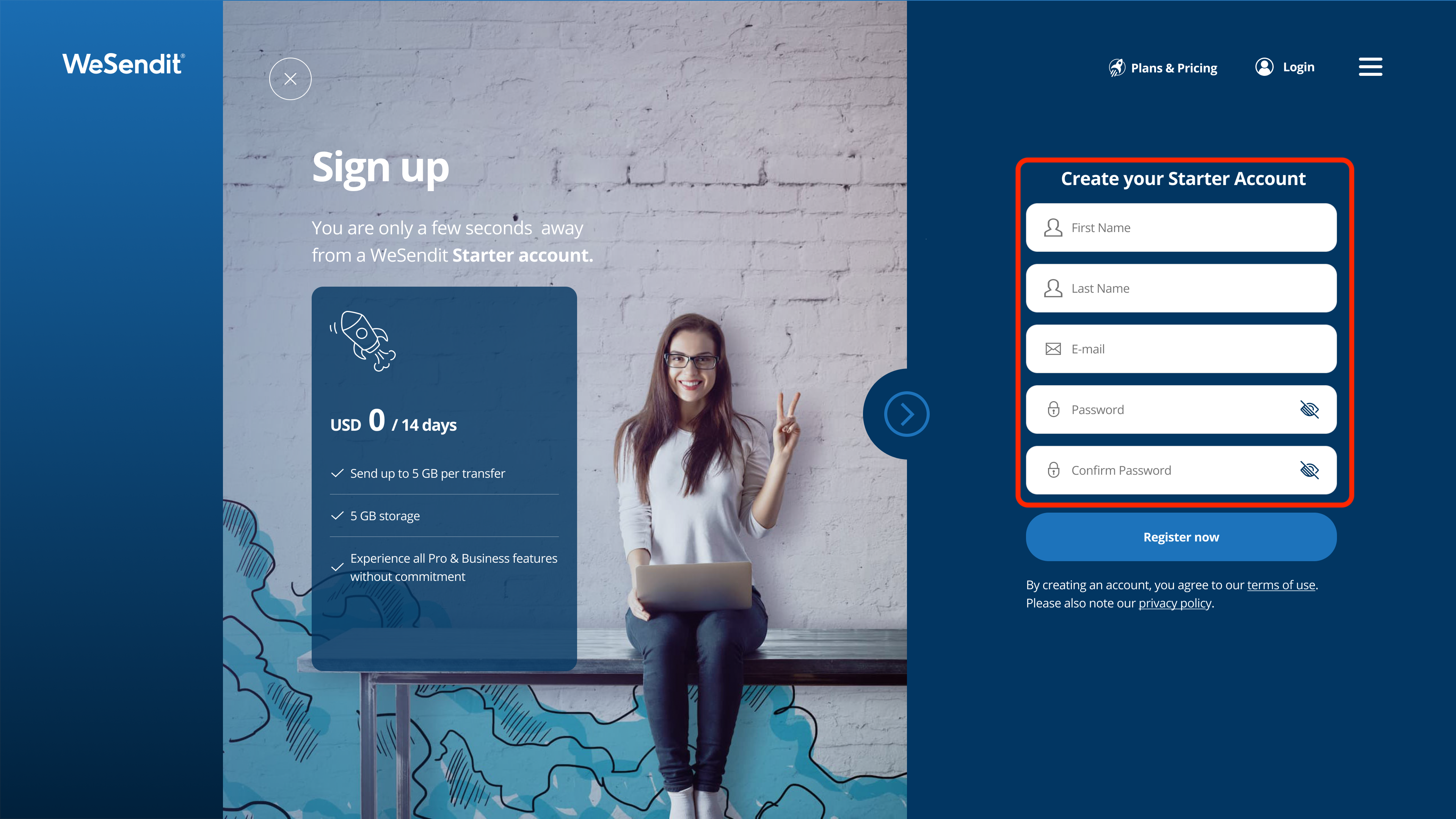 Navigate to the WeSendit® homepage and click on the "Sign Up" or "Create Account" button to begin the process.