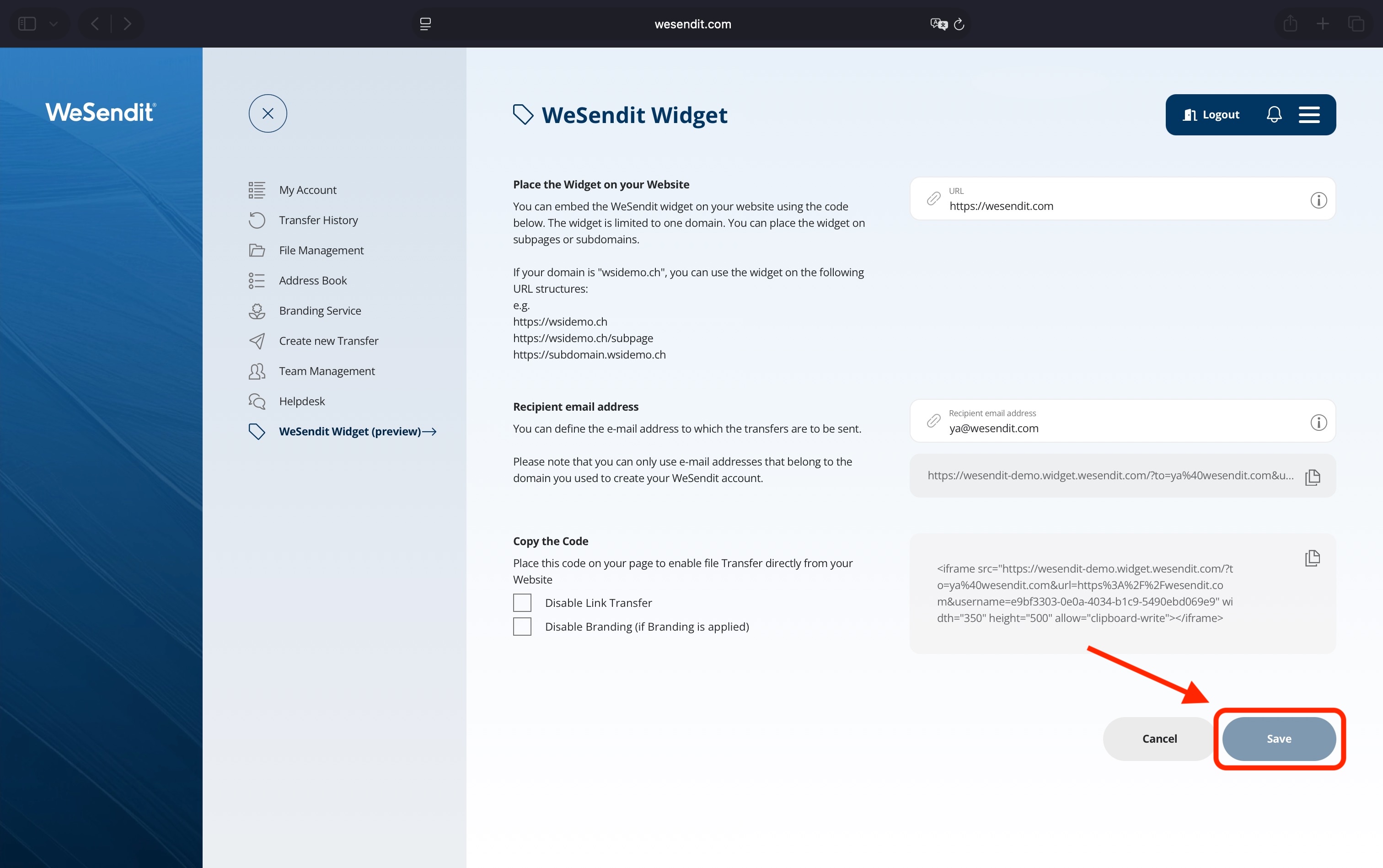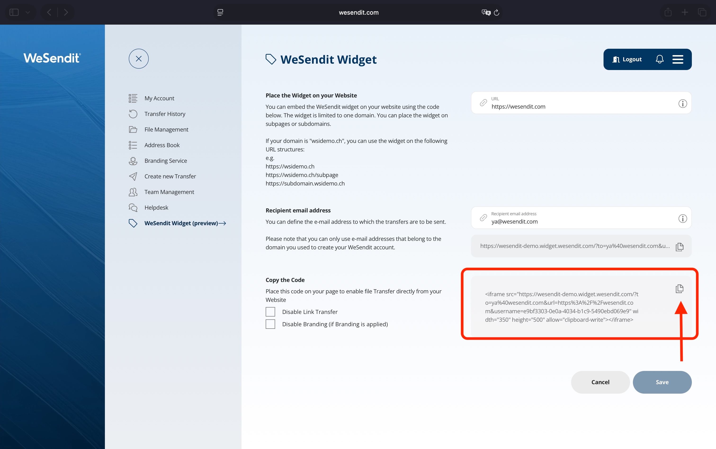 - Log in to your account and select "WeSendit Widget" from the menu.