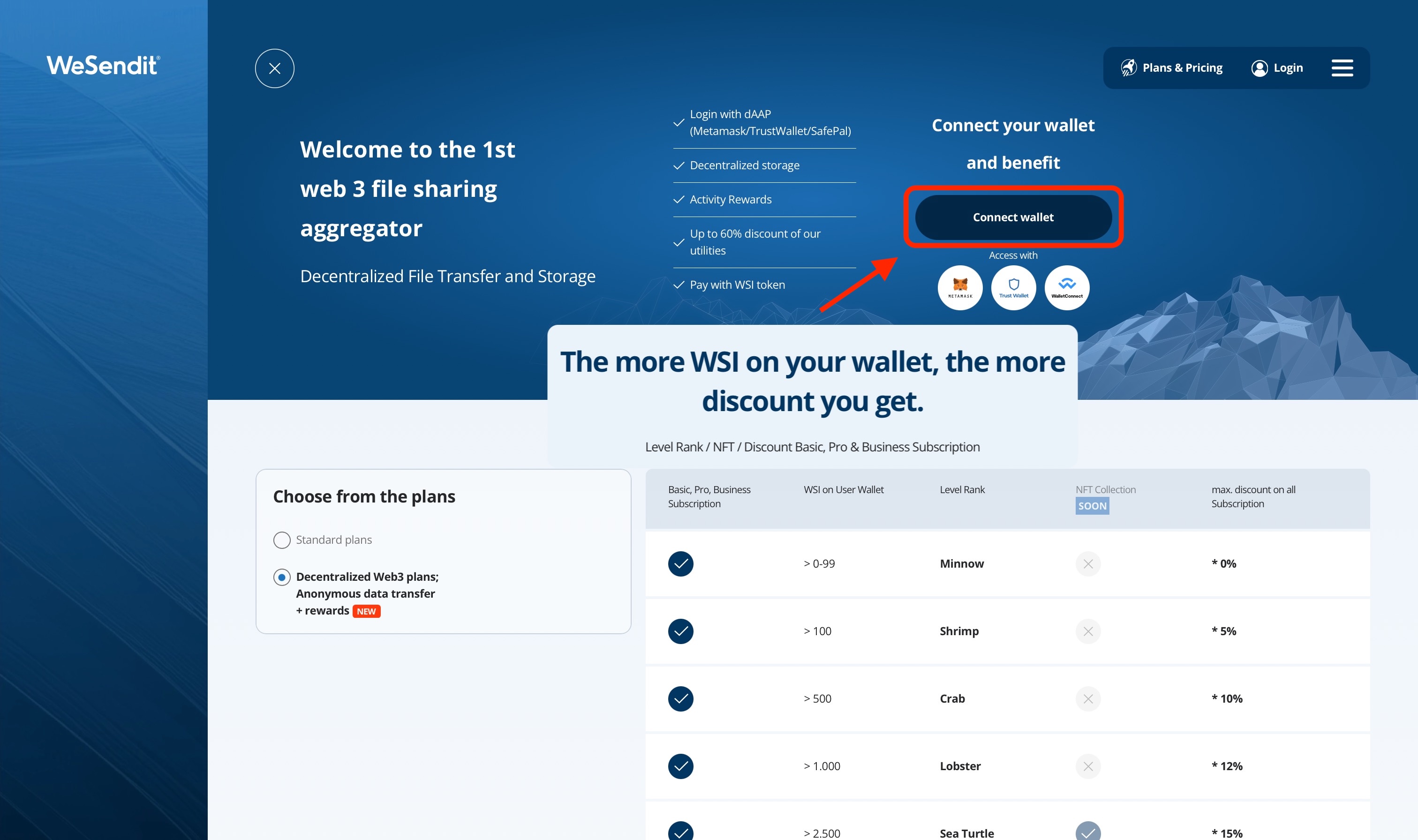 Visit wesendit.com, go to Plans & Pricing, enable Decentralized Web3 plans, and click Connect Wallet. - Choose a plan