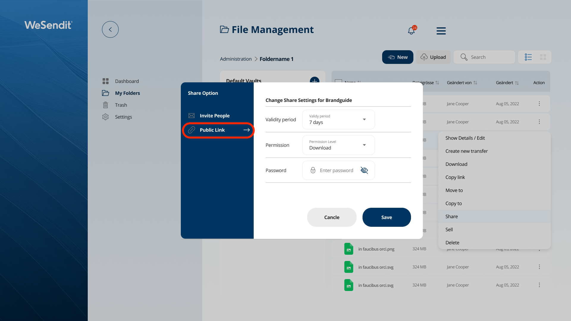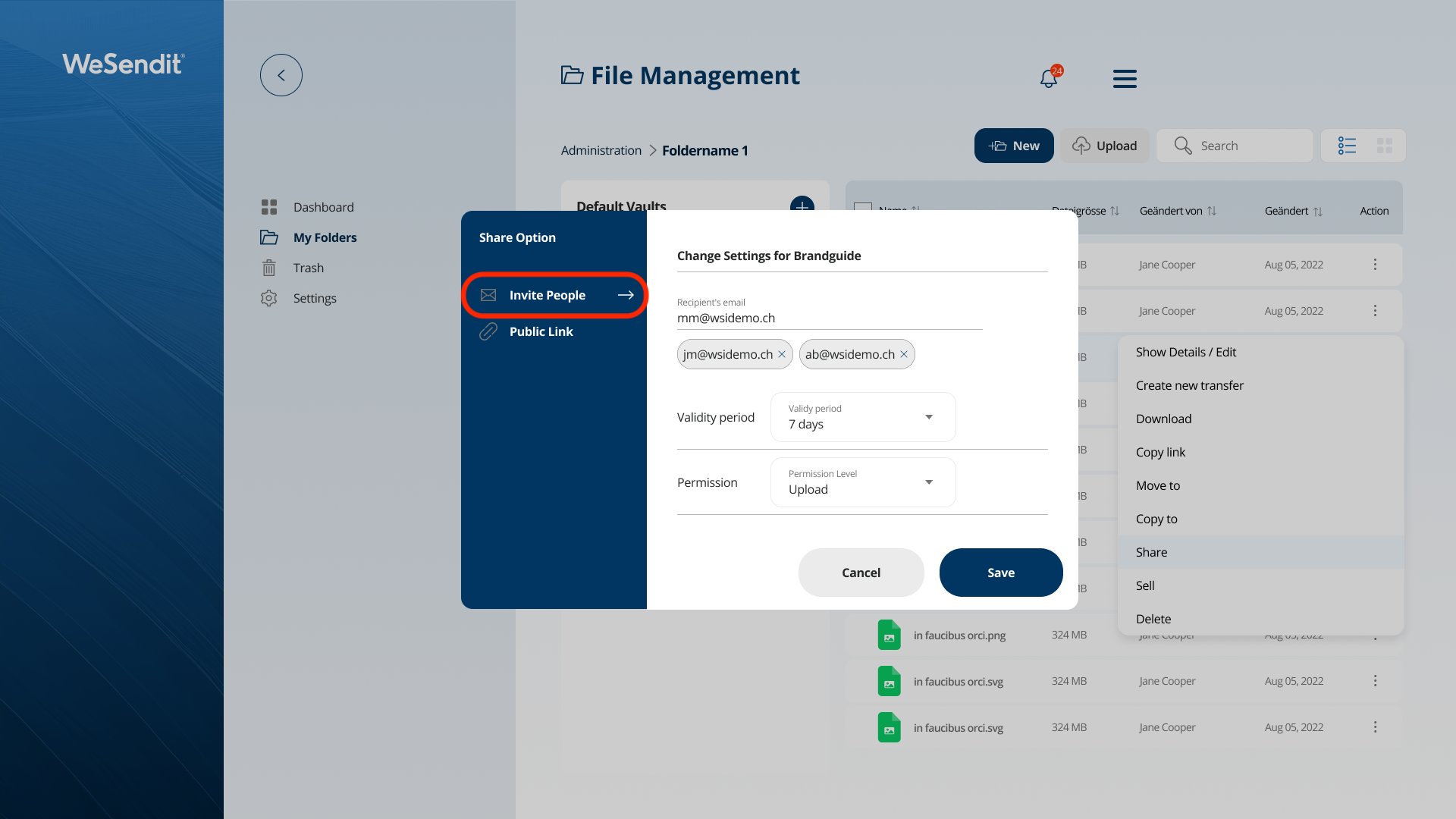 In this article, you will learn how to use WeSendit® sharing features to optimize collaboration with partners and clients. We explain the difference between public links and email invitations, as well as the various security levels available.