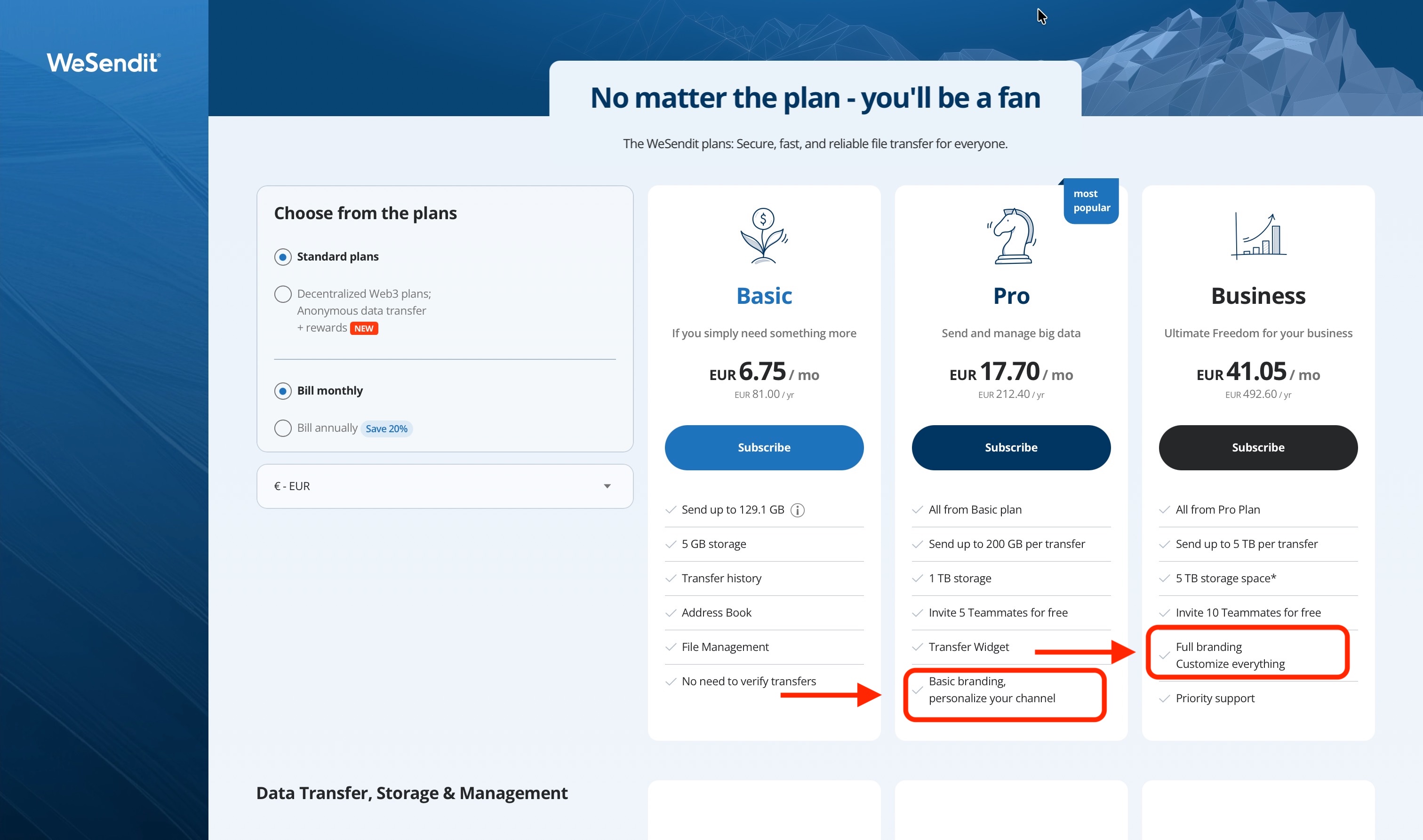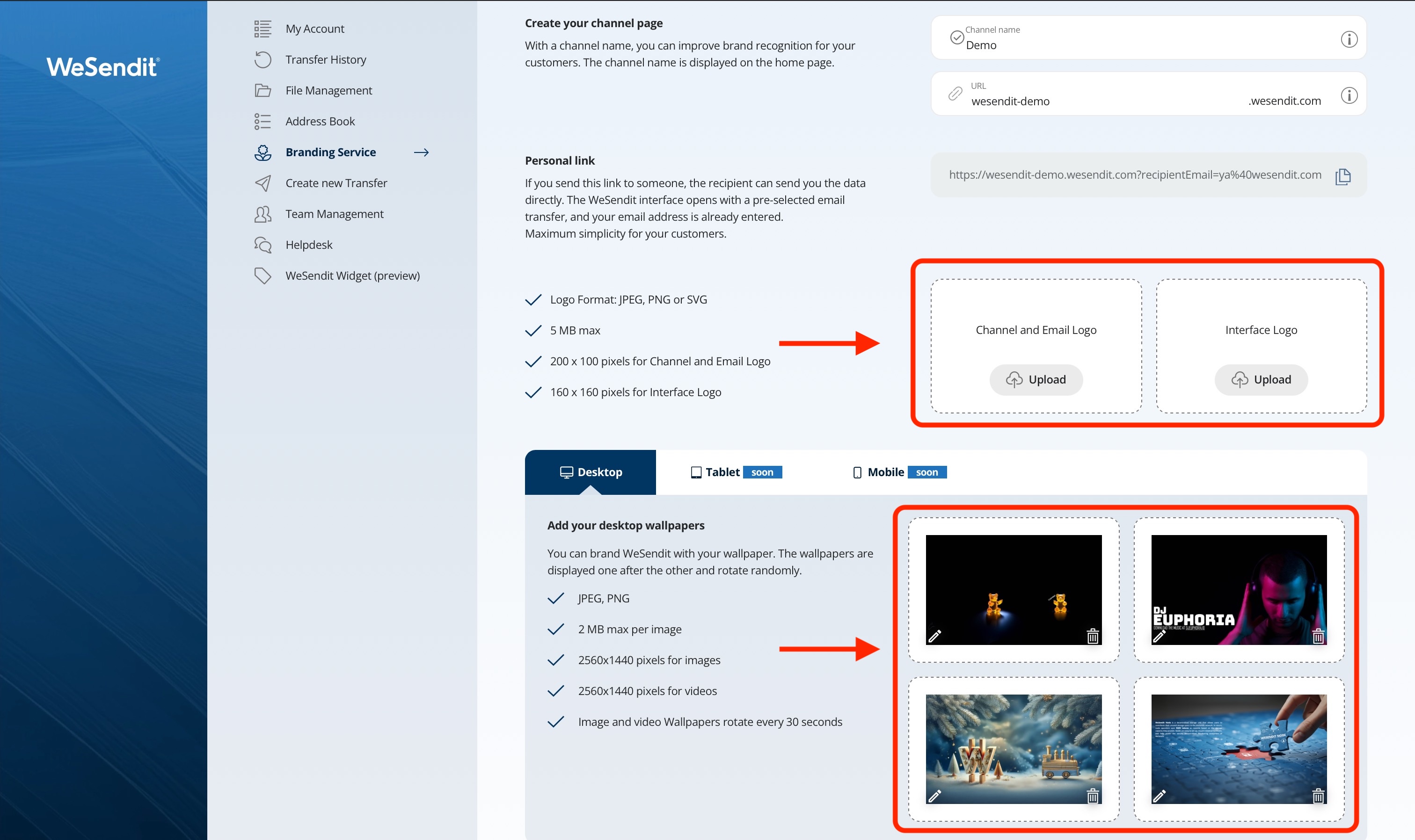 yourname.wesendit.com). - Full Branding: Additionally offers logo uploads for the interface and emails, up to four rotating backgrounds, and the ability to link your own website directly in the wallpaper.